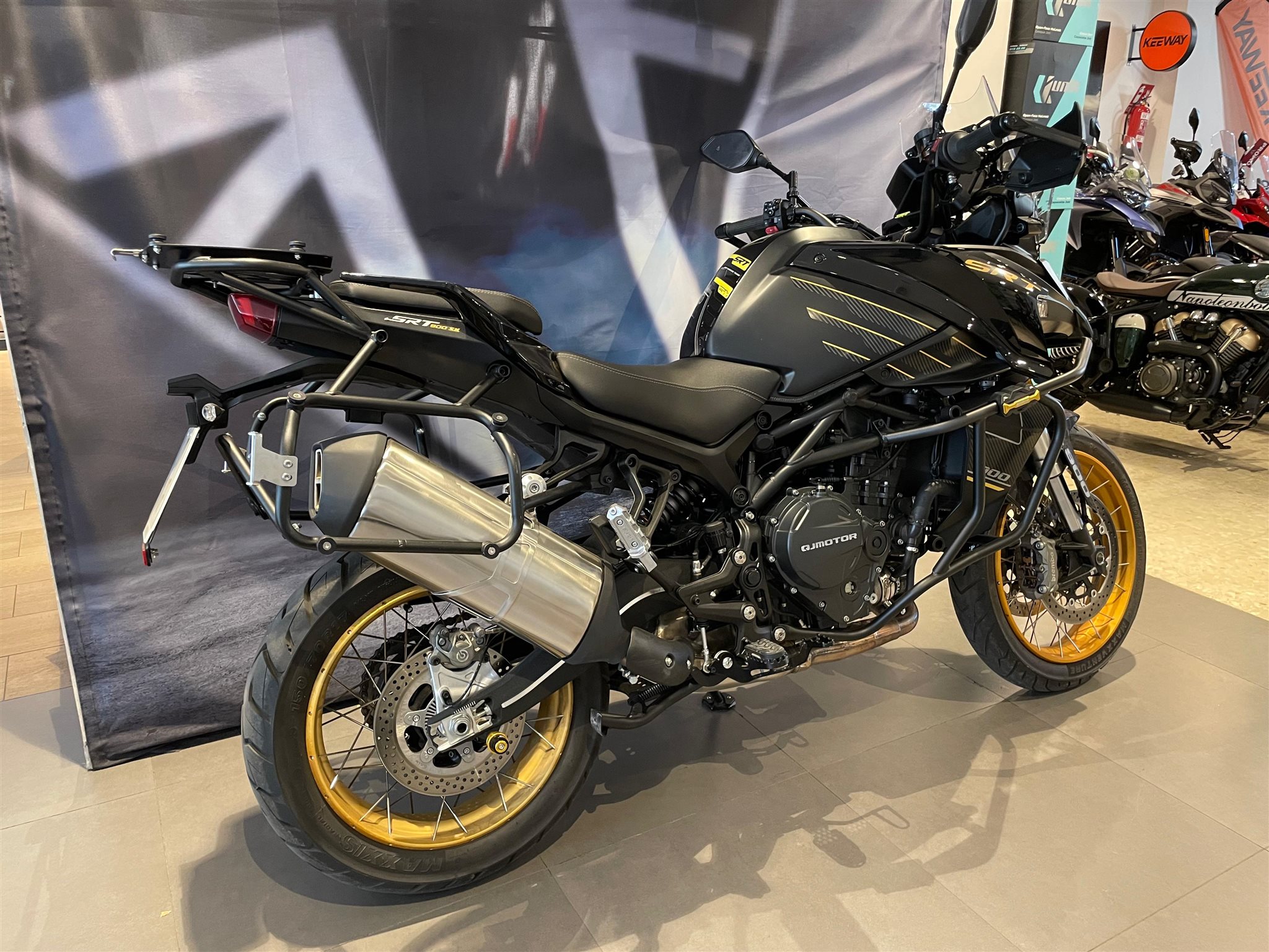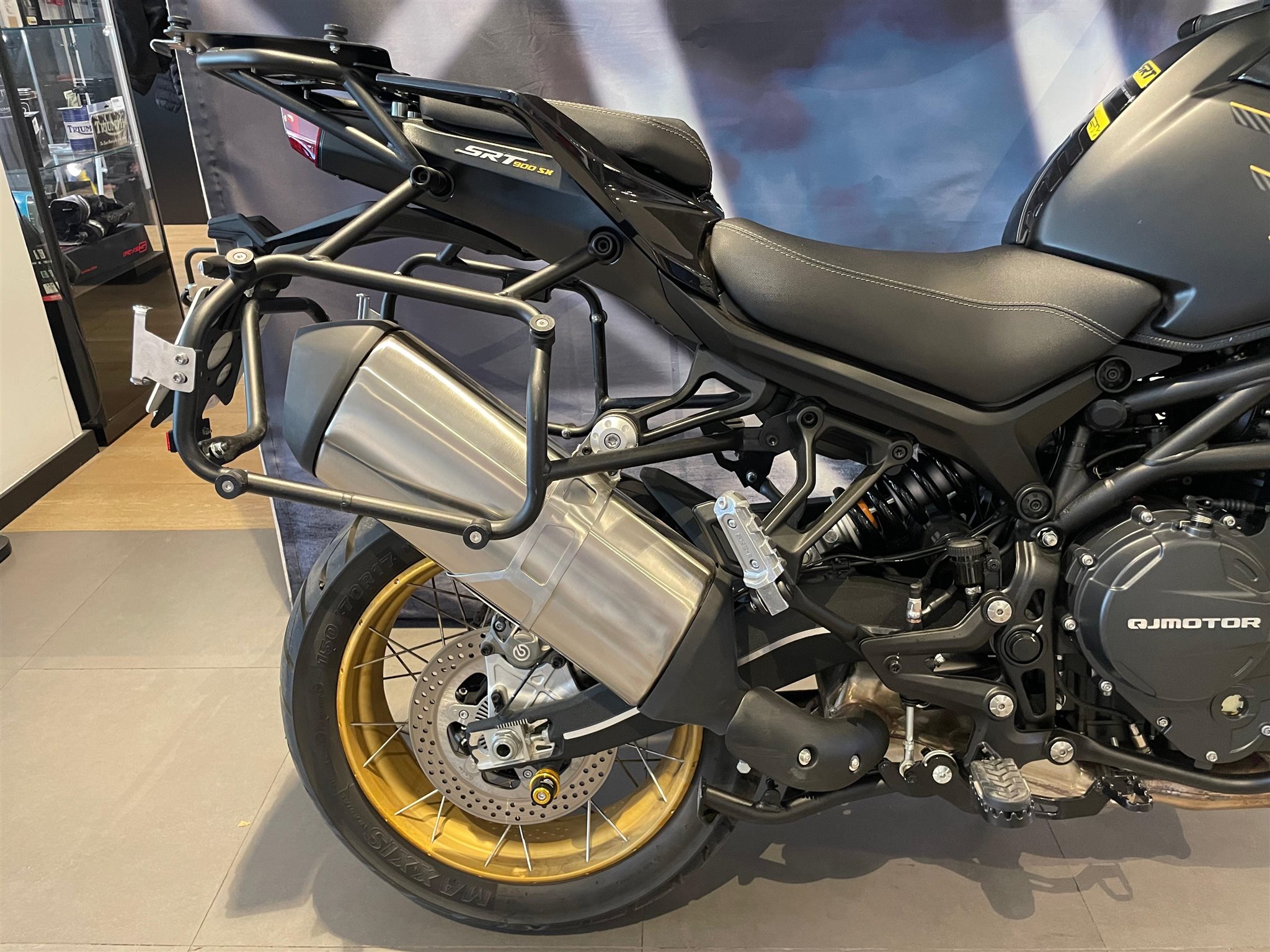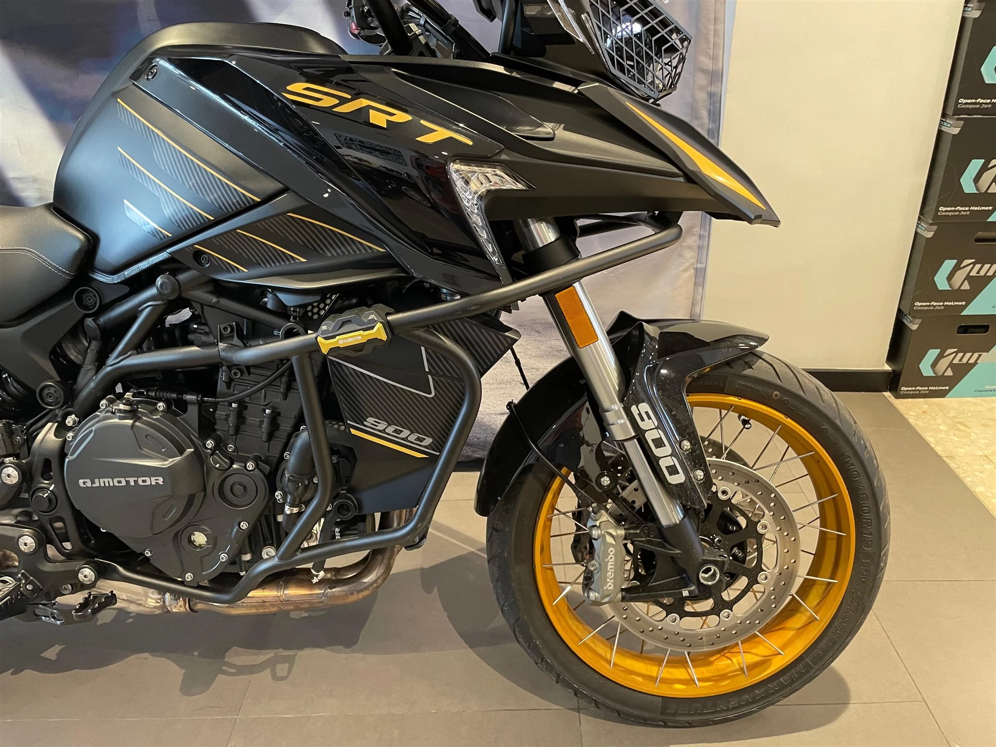 Moto QJMotor SRT 900 SX en llamativos colores negro y dorado.