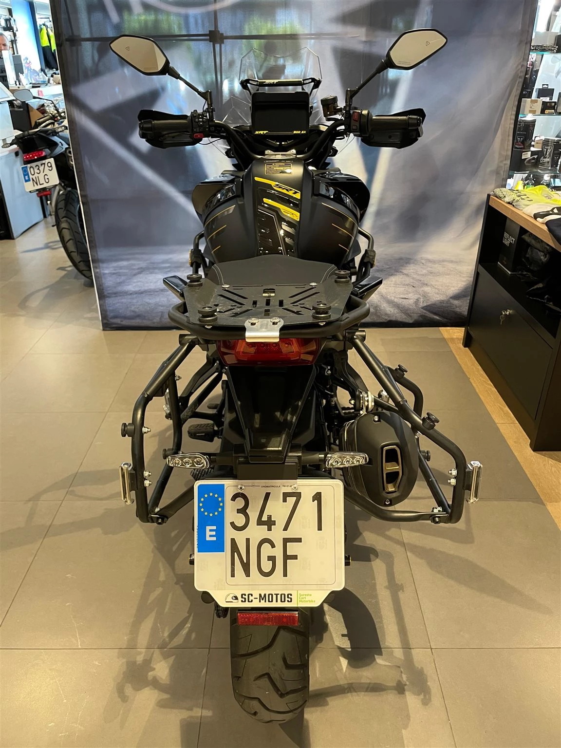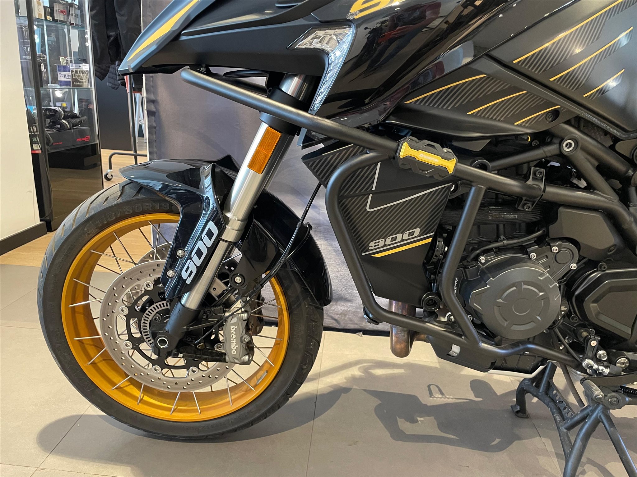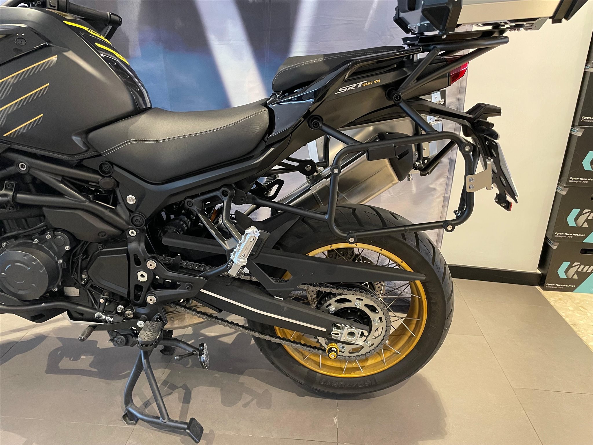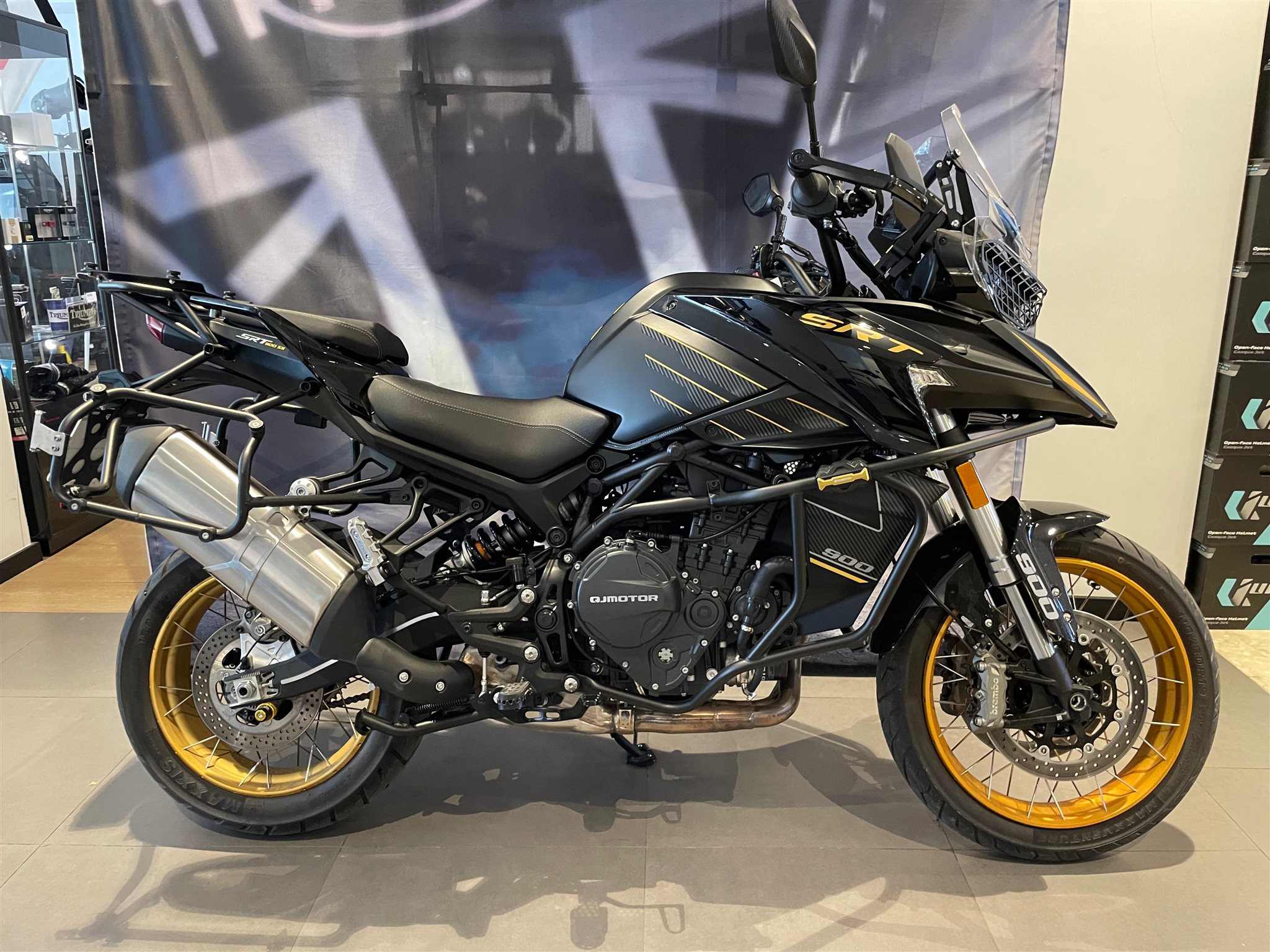 Moto QJMotor SRT 900 SX en llamativos colores negro y dorado.
