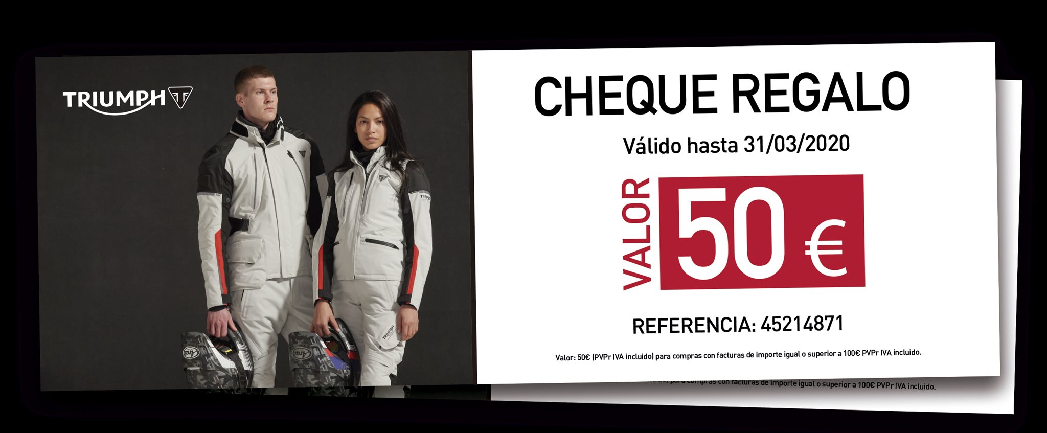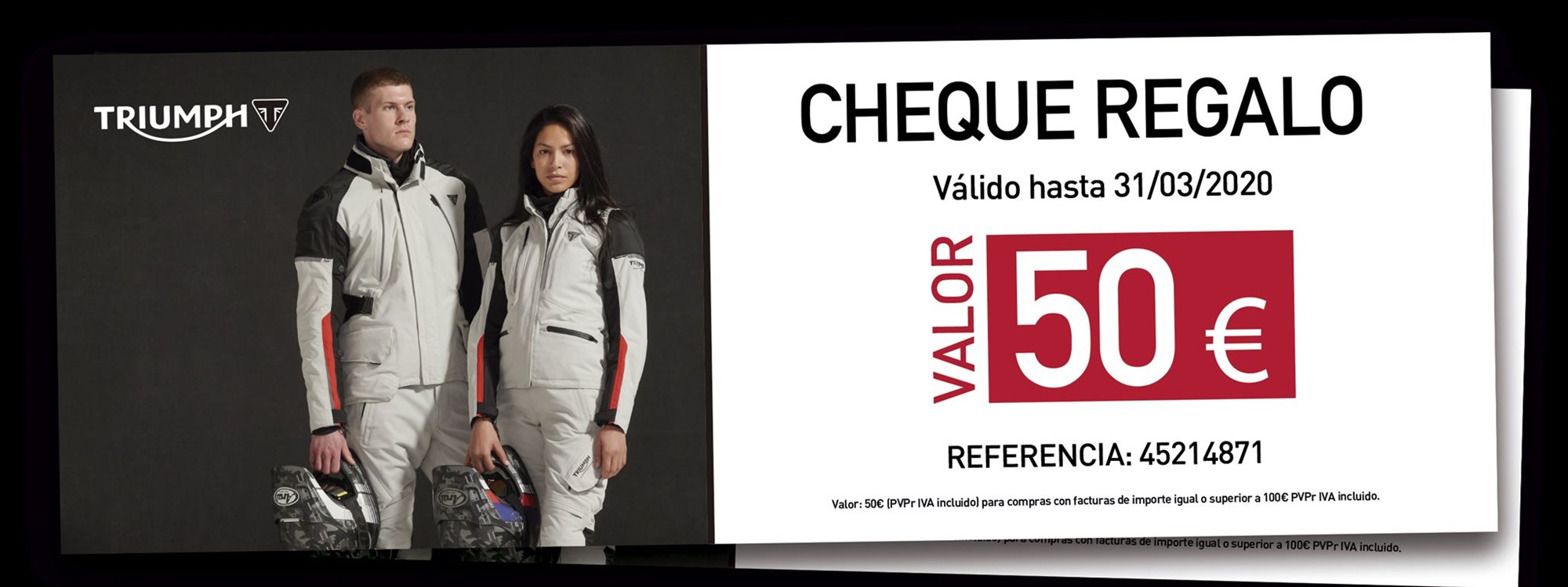 Ahora y hasta final de mes puedes comprar todo el catálogo de ropa Triumph con unos precios increíbles, ahorra en toda la ropa técnica el 35%. Además tendrás un descuento extra de 50 € del cheque Triumph Style Days (oferta aplicada a todas las compras superiores a 100 €).