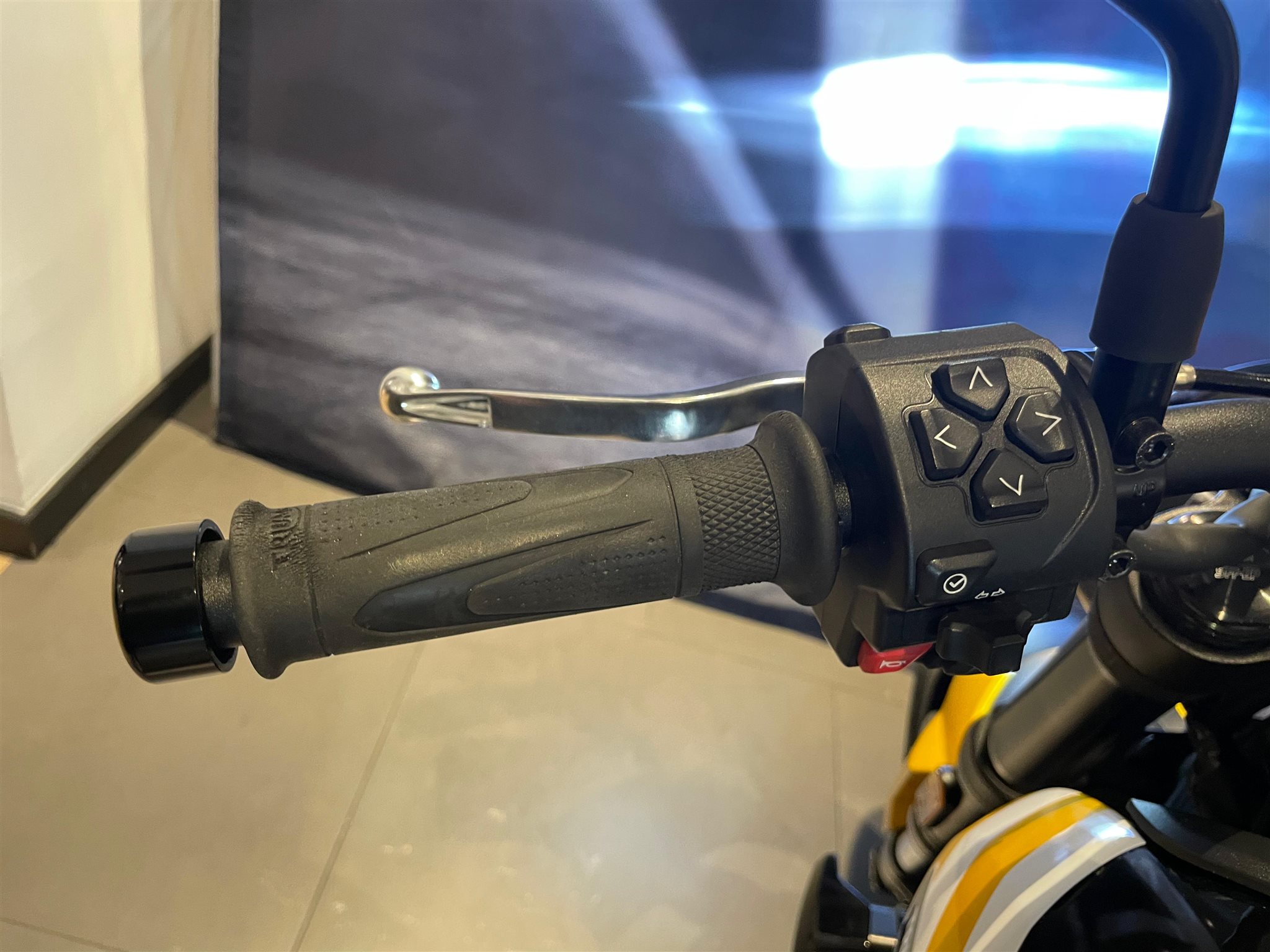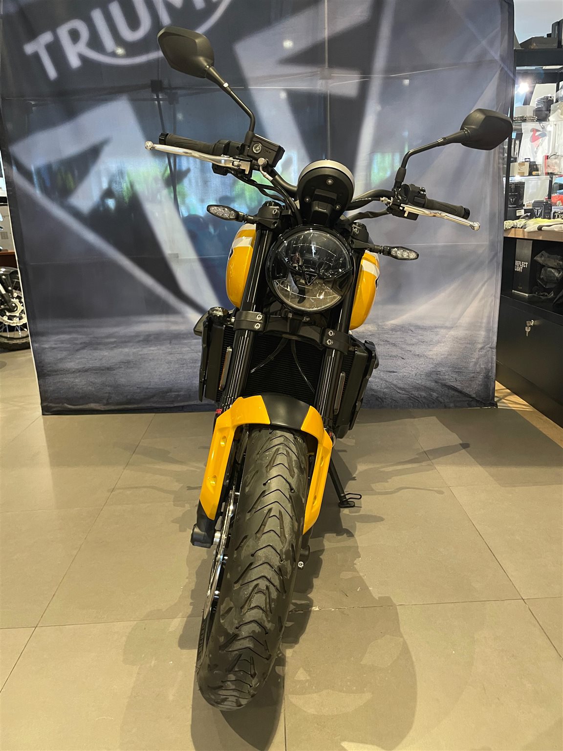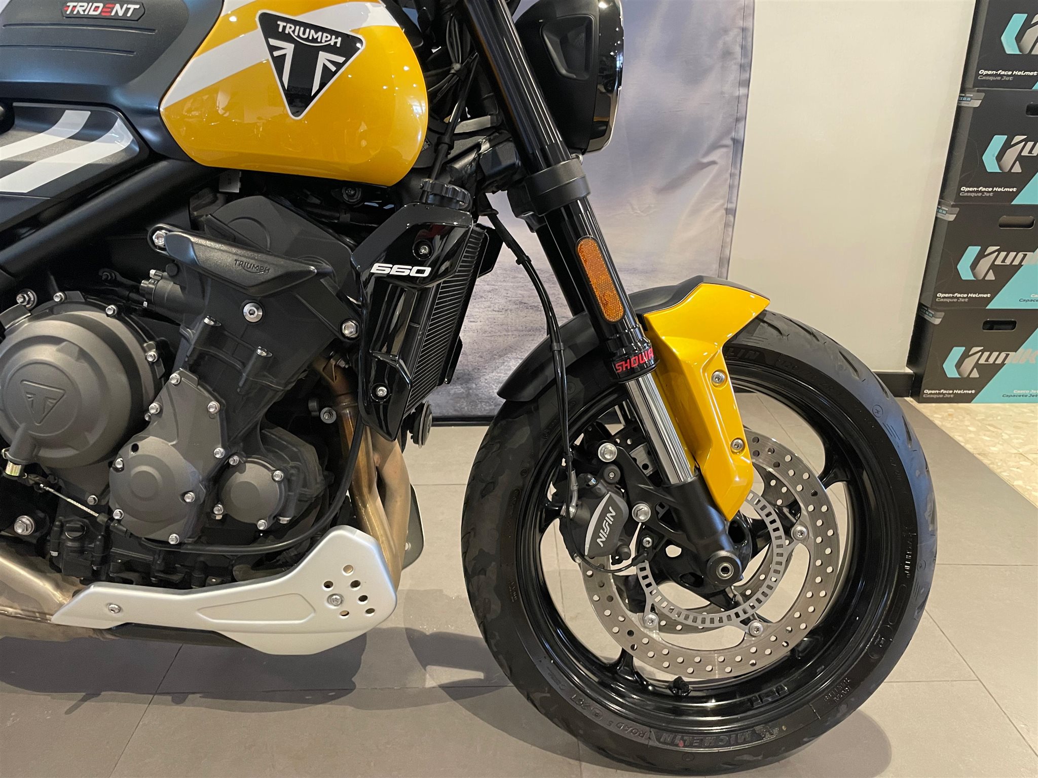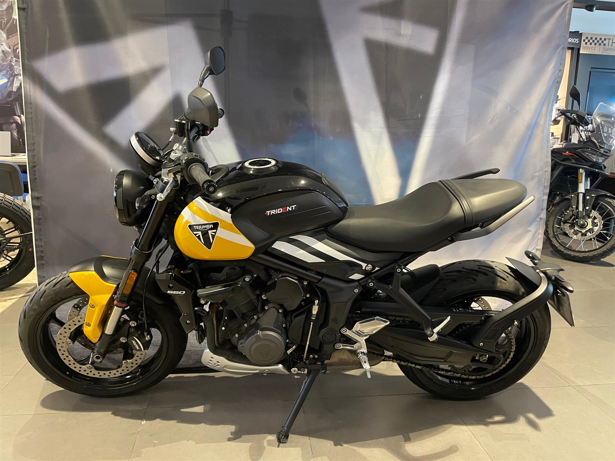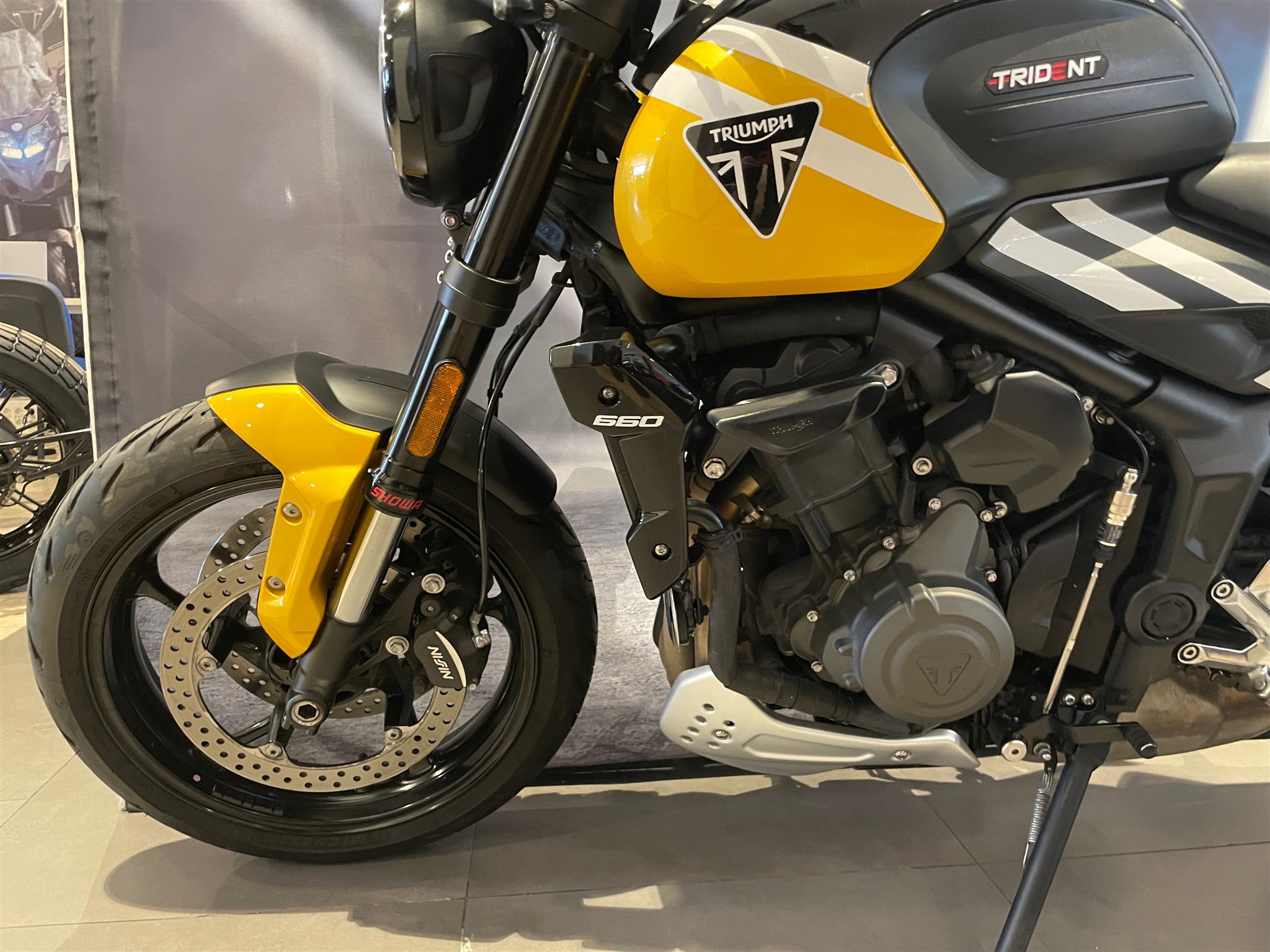 Moto Triumph Trident 660 en color amarillo, con detalles en negro. Ideal para disfrutar de la carretera.